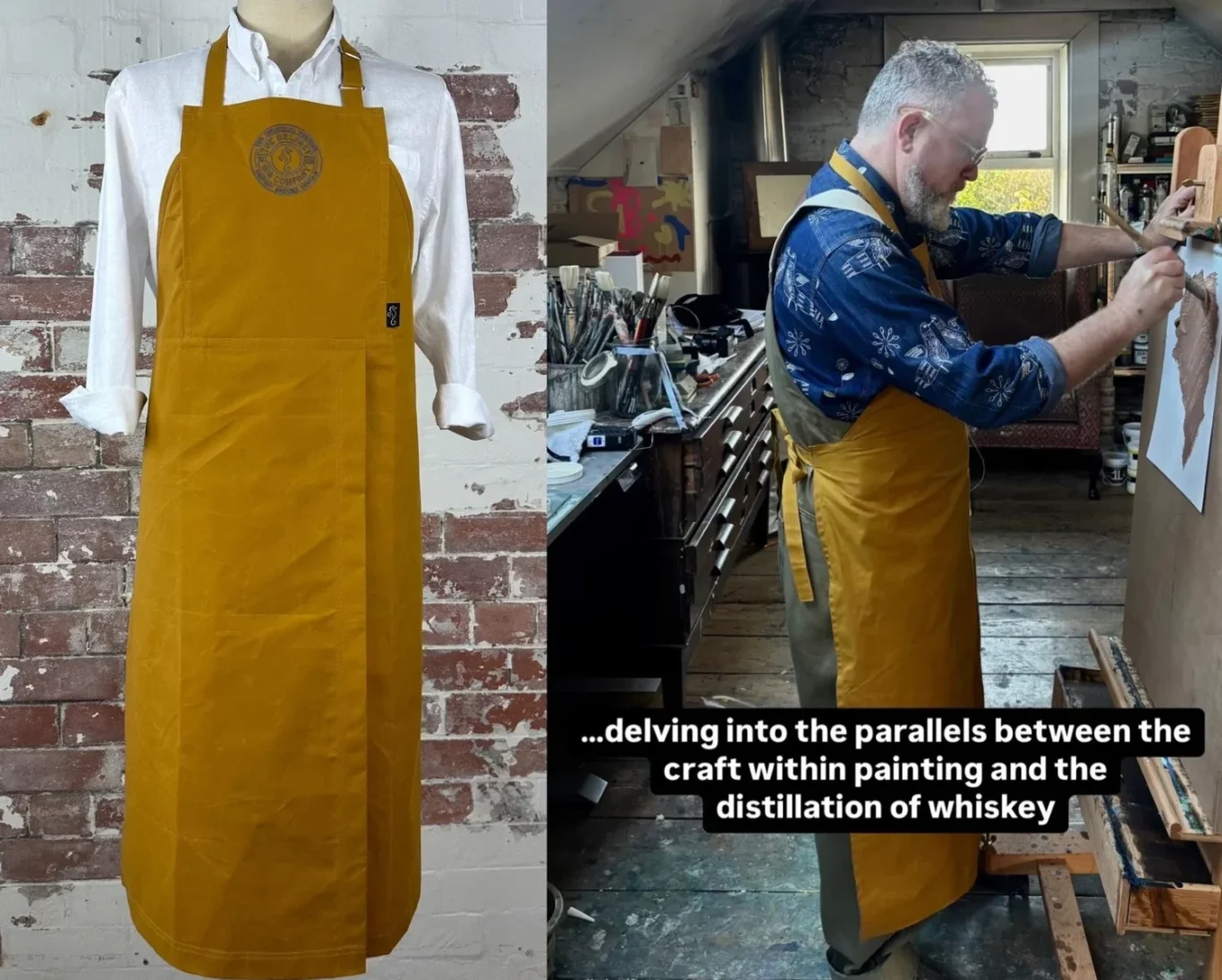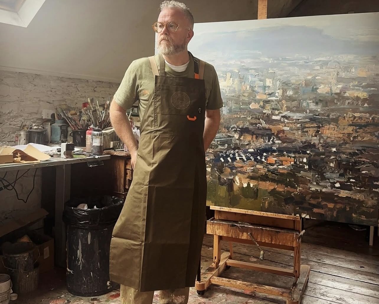 Given his remarkable talent, Colin seemed the perfect choice to trial the 'Clonard' bibbed apron, which is designed with artists and artisans in mind. With its extra-long length and split front, the apron is not only practical but also an ideal accessory for any studio, blending style with functionality.